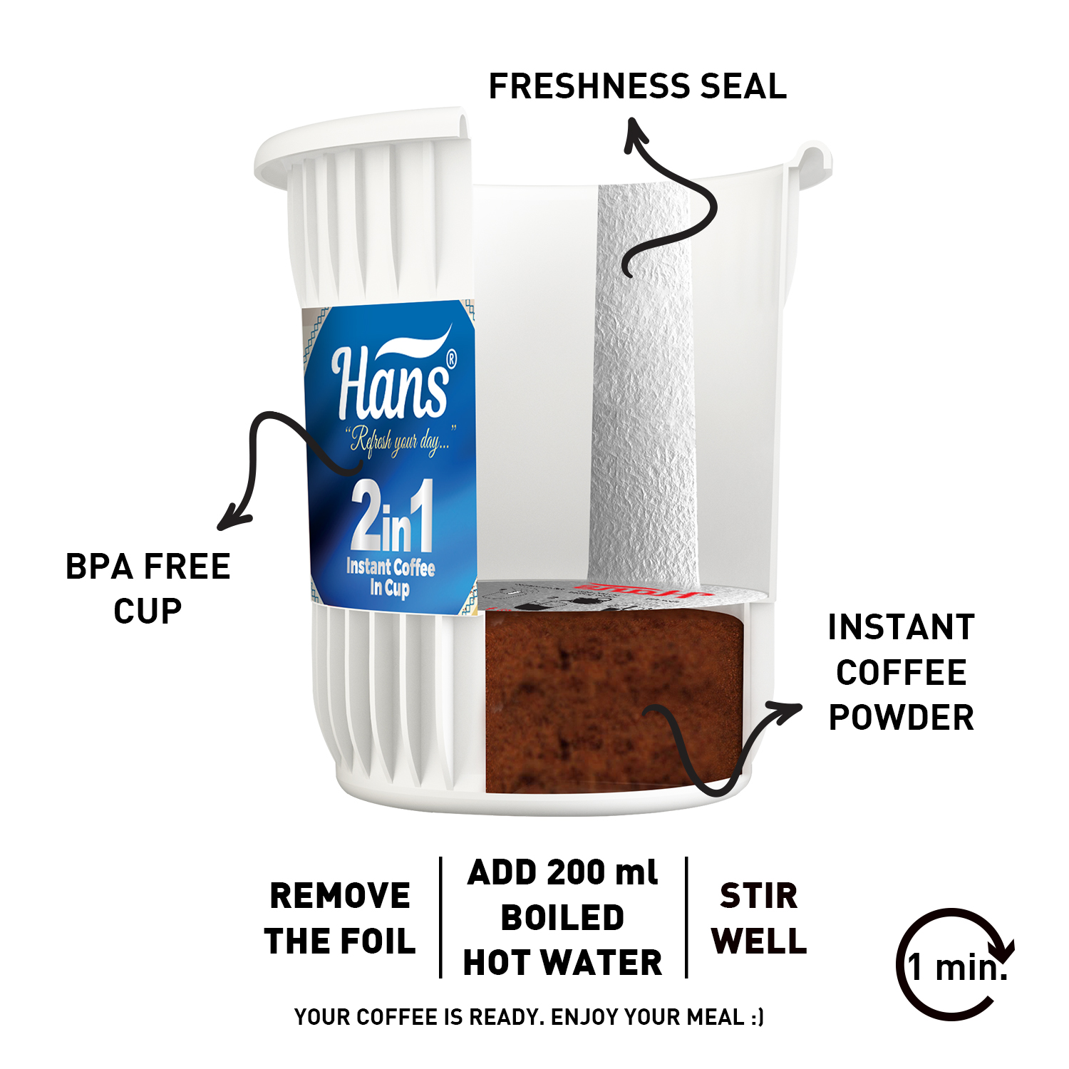 Ambalaj İçeriği: 6 adet 2si1 arada Bardakta Hazır kahve, 6 adet Kapak ve Karıştırıcı